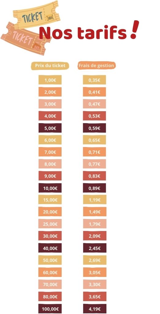 Vous pouvez choisir de prendre en charge ces frais et dans ce cas, ils seront déduits du montant que vous aurez récolté sinon laisser les frais à la charge de chaque participant, le prix du ticket sera alors majoré de ces frais.