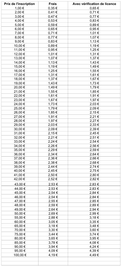 Tableau complet avec les frais si vous décidez de nous laisser la charge de vérifier la conformité des licences ou certificats des participants.